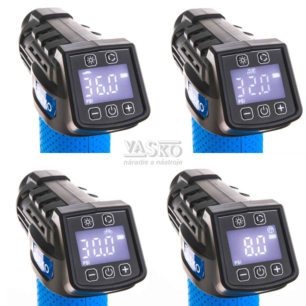 . Manuálne nastavte požadovaný prevádzkový tlak. Zapnite LED svetlo. Zariadenie ponúka 4 prednastavené režimy – pre autá, motocykle, bicykle a lopty.