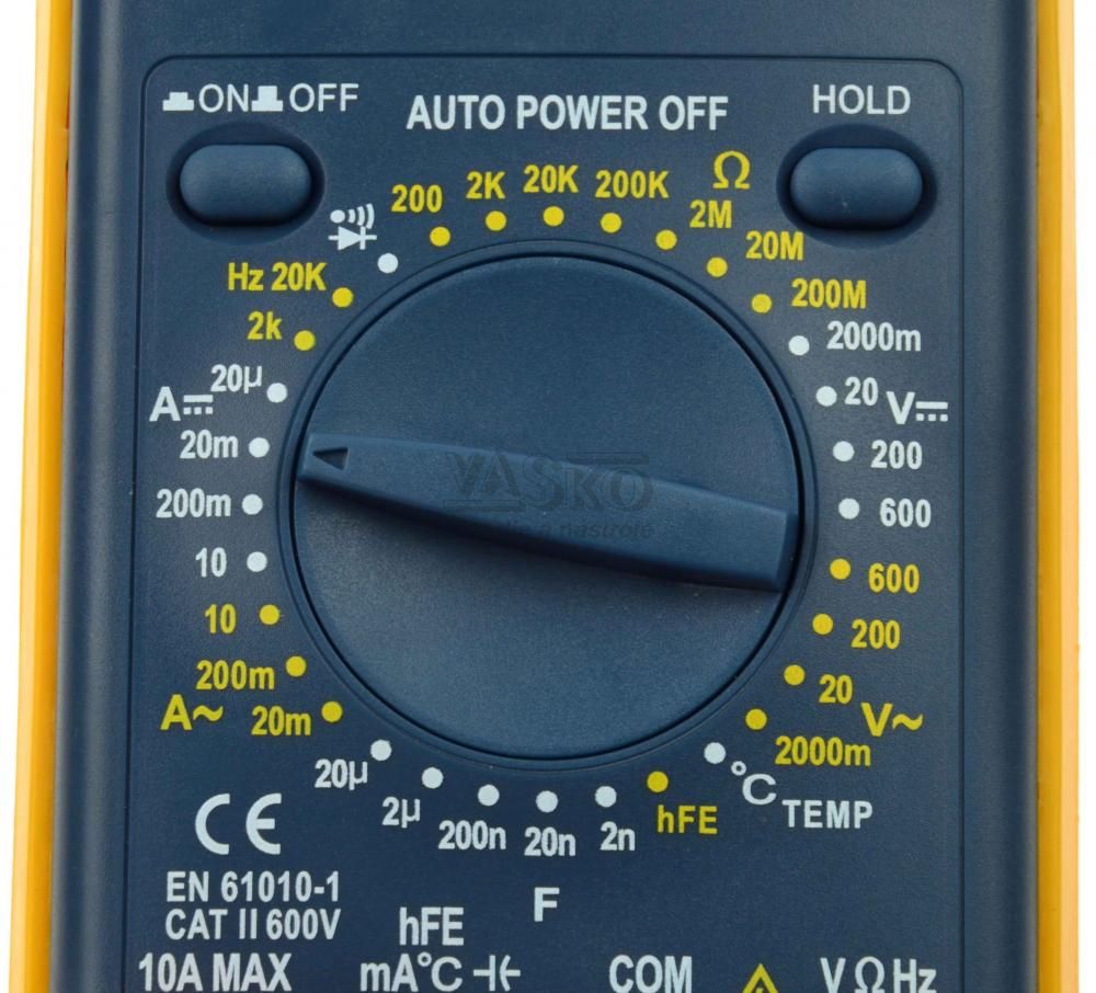 Meranie: striedavé napätie, jednosmerné napätie, striedavý prúd, jednosmerný prúd, odpor, frekvencia, kapacita, teplota a zisk tranzistora (hFE)