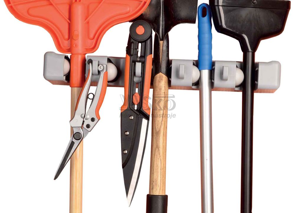 Držiak záhradného náradia 5-dielny, valčekový, RAMPDržiak je vybavený automatickými valčekmi a navyše samostatnými vešiakmi na menšie predmety, ako je lopatka, metla, handrička a pod. Použiteľné pre náradie s priemerom rukoväte menším ako 33 mm.