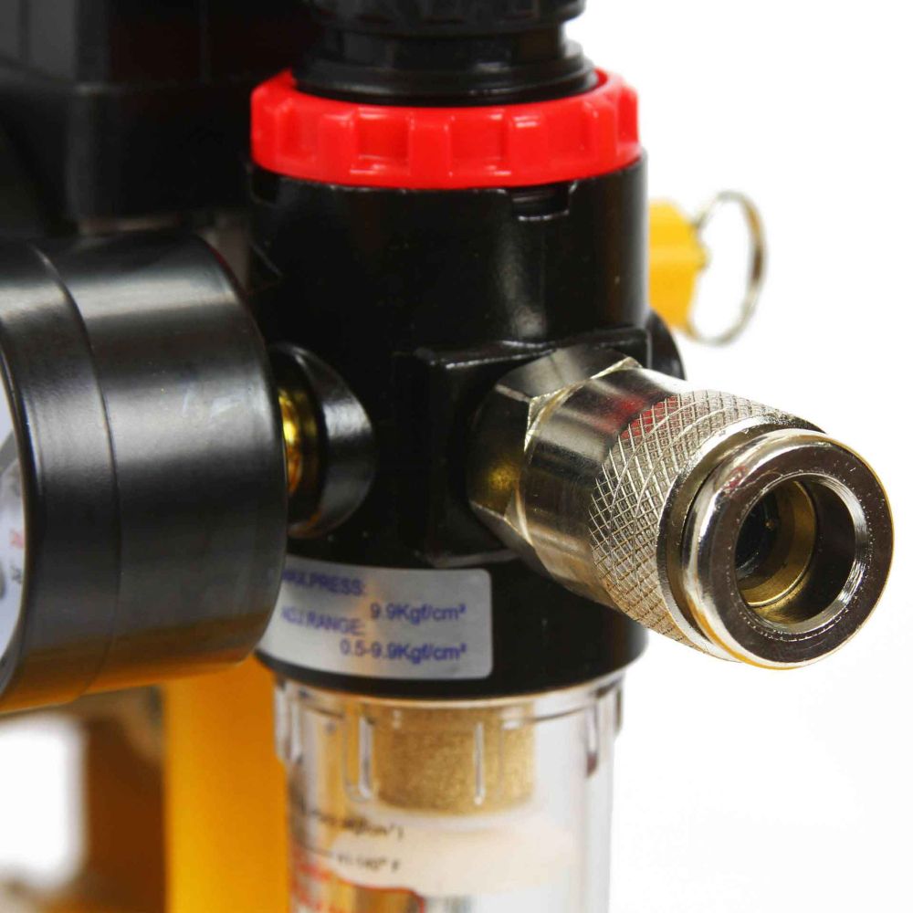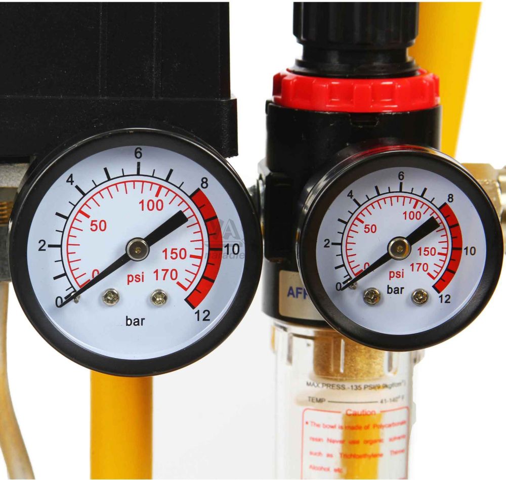 Kompresor je vybavený odlučovačom vody, regulátorom, redukčným ventilom tlaku, 2 presnými tlakomermi, poistným ventilom a vzduchovým filtrom pre predĺženie životnosti.- Vhodné na čerpanie, čistenie, fúkanie, lakovanie a obsluhu pneumatických zariadení.