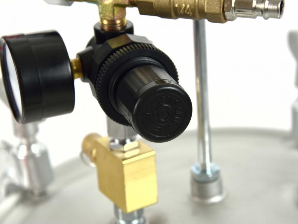 Pneumatická striekacia pištoľ používaná v kombinácii s nádobou na farbu. Sada je charakterizovaná veľmi dobrými parametrami rozptylu a vysokou rýchlosťou striekania. Šírka nástreku 40 cm vo vzdialenosti 20 cm od maľovaného povrchu. Striekací systém umožňuje použitie veľkého množstva farieb, ktoré sa dajú rýchlo aplikovať, pričom šetrí čas a peniaze.Tlaková nádoba z hladkej ocele s vysokou odolnosťou proti korózii vďaka potiahnutiu nádrže neelektrolytickým metalickým povlakom "Dacromet". Dakrometizácia je proces, pri ktorom sa používa vodná disperzia máčaním alebo striekaním, čo takmer úplne vylučuje riziko vodíkovej korózie. Povlak je počas výroby pasivovaný a poskytuje vysokú odolnosť proti korózii.