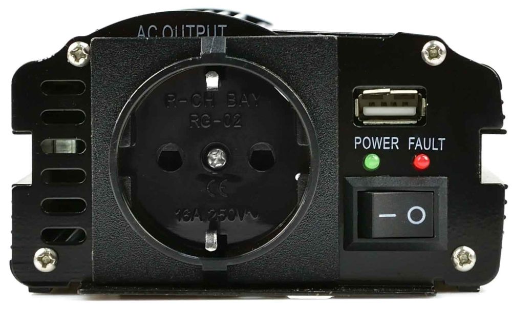 - Menič napätia, vstup 12V/ výstup 230V, trvalý výkon 250W/nárazový výkon 500W, GEKO
