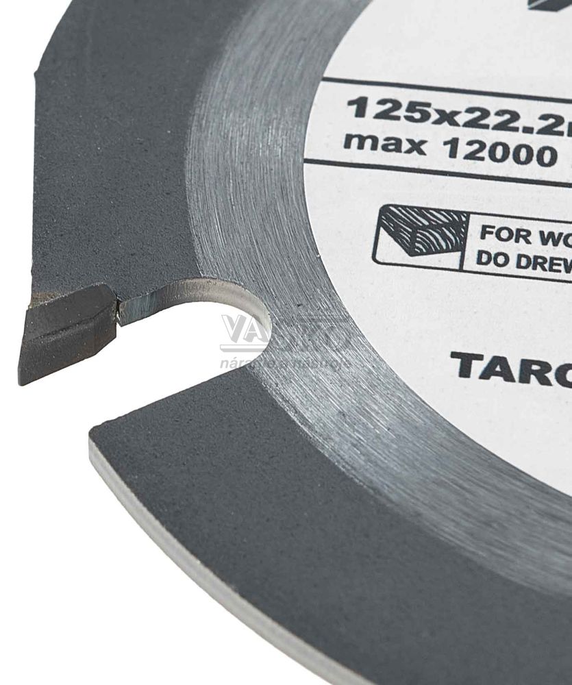 Rezný kotúč na drevo. Vyrobený zo zliatiny mangánovej ocele Mn65, vysoko odolný voči teplote a deformácii. Zuby s karbidovými hrotmi umožňujú hrubé rezanie dreva a materiálov na báze dreva.125 mm kotúč je určený na použitie s pílami a drážkovačmi do stien, ktoré majú dodatočný bezpečnostný kryt. Nie je určený na použitie s uhlovou brúskou.