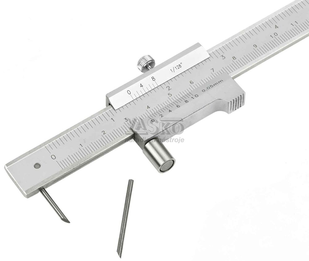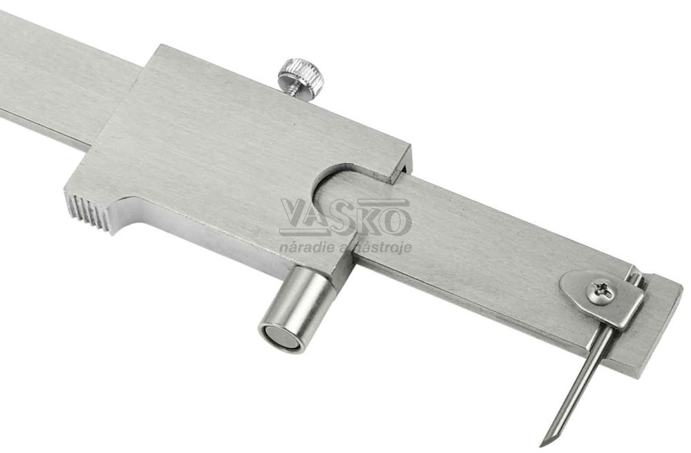 Značkovacie posuvné meradlo s pracovnou dĺžkou 200 mm a presnosťou 0,05 mm. Určené na presné značenie pomocných čiar na obrobkoch. Obzvlášť užitočné na vŕtanie, frézovanie, sústruženie atď. Vyrobené z nehrdzavejúcej ocele, má kalenú oceľovú dosku (druhá doska je súčasťou balenia). Stupnica je v mm a palcoch.