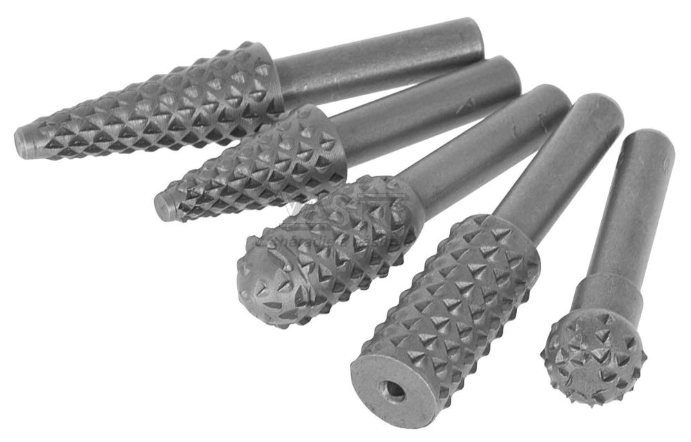 Sada brúsnych teliesok-rašplí na stopke, 5-dielna. Stopka 6,3 mm. Použitie : Brúsenie dreva