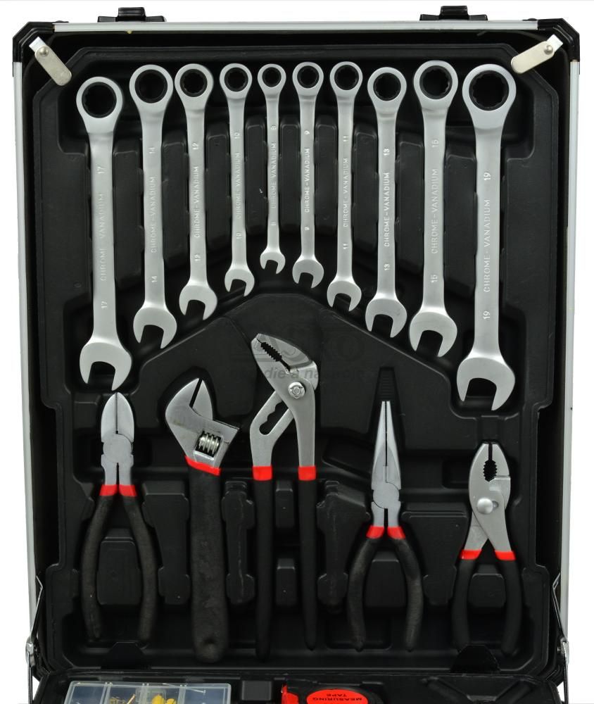 Kľúče sú vyrobené z veľmi odolnej chrómovej vanádiovej ocele. Sada obsahuje najbežnejšie používané nástroje. Vďaka priestrannému a praktickému puzdru sa nástroje dajú vziať všade. Všetky nástroje sa zmestia do 4 zásuviek vo veľmi pevnom kufri. Kufor má výsuvnú rukoväť a pogumované transportné kolesá.Sada obsahuje: