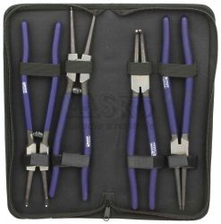 Profesionálna sada 12" klieští, 300mm . Zaisťovacie kliešte slúžia na montáž a demontáž poistných krúžkov. Existujú 2 typy týchto ochrán: vnútorná (rozširujúca sa vnútri objímky) a vonkajšia (upínacia, mimo hriadeľa). Sada je prispôsobená na prácu s vnútornými krúžkami a vonkajšími.Má kliešte so zakrivenými a rovnými hrotmi.Kliešte sú vyrobené z odolnej a odolnej ocele.Veľmi kvalitné kliešte Seger, nenahraditeľné v autodielňach a pre súkromných užívateľov.