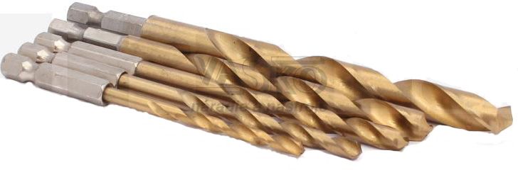 Súprava vrtákov z rýchloreznej nástrojovej ocele (HSS) s titánovým povlakom. Sada obsahuje vrtáky s priemermi 4 mm, 5 mm, 6 mm, 8 mm a 10 mm, ktoré majú 1/4 palcovú šesťhrannú stopku, umožňujúcu rýchlu a pohodlnú výmenu vrtáka v skrutkovači. Tieto vrtáky sú určené na vŕtanie do kovu, dreva a plastov.Vlastnosti: