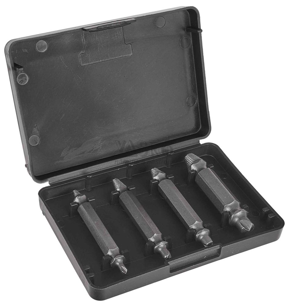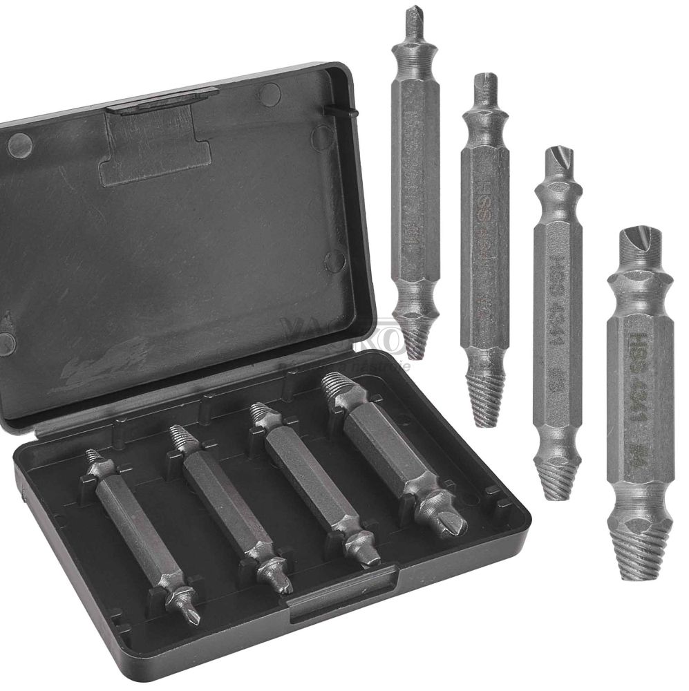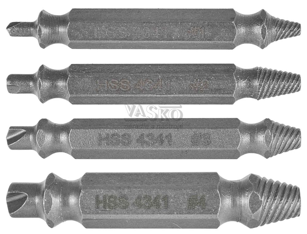 Univerzálny vyťahovač skrutiek vyrobený z rýchloreznej nástrojovej ocele HSS. Navrhnuté na prácu v štandardnej vŕtacej hlave.Popis: Vyťahovač zlomených skrutiek HSS 4341 4 ks je sada univerzálneho náradia na odstránenie zlomených skrutiek. Vyťahovače sú vyrobené z rýchloreznej nástrojovej ocele HSS, čo zaručuje ich odolnosť a účinnosť. Sada obsahuje štyri rôzne veľkosti: 1, 2, 3, 4, ktoré sa hodia na štandardné vŕtacie hlavy. Pomocou tohto nástroja ľahko a efektívne odstránite zlomené skrutky.
