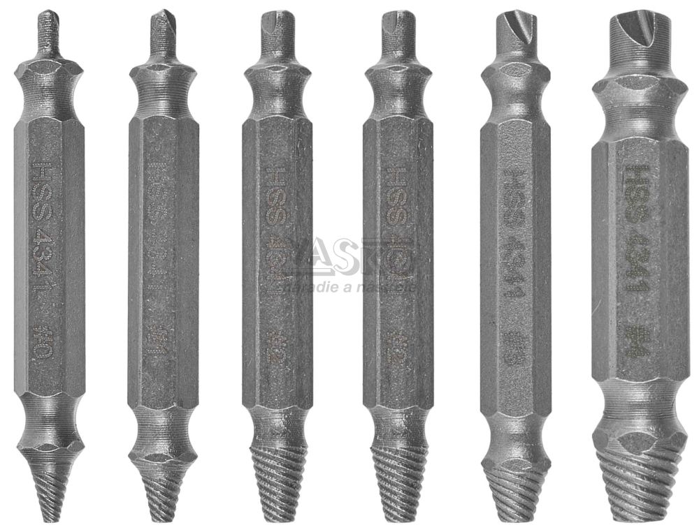 Univerzálny vyťahovač skrutiek vyrobený z rýchloreznej nástrojovej ocele HSS. Navrhnuté na prácu v štandardnej vŕtacej hlave.Popis: Vyťahovač zlomených skrutiek HSS 4341 6 ks je sada univerzálneho náradia na odstránenie zlomených skrutiek. Vyťahovače sú vyrobené z rýchloreznej nástrojovej ocele HSS, čo zaručuje ich odolnosť a účinnosť. Sada obsahuje štyri rôzne veľkosti: 1, 2, 3, 4, 5,6 ktoré sa hodia na štandardné vŕtacie hlavy. Pomocou tohto nástroja ľahko a efektívne odstránite zlomené skrutky.