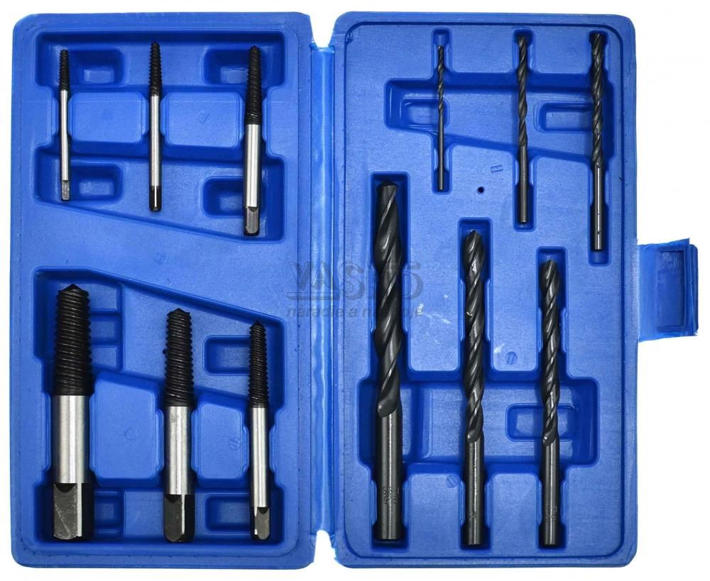 Sada vyťahovačov a HSS vrtákov na zlomené skrutky. Sada obsahuje 6 kusov ľavostranných vyťahovačov so štvorcovým koncom - umožňujúcim montáž na rukoväť kohútika. Okrem toho súprava obsahuje vystružovacie vrtáky vo veľkostiach: 2, 3, 4, 6, 7 a 9,5 mm.Parametre