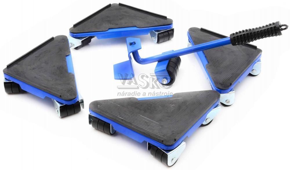 Sada na presúvanie nábytku pozostávajúca zo 4 plošín na kolieskach a 1 zdviháka.