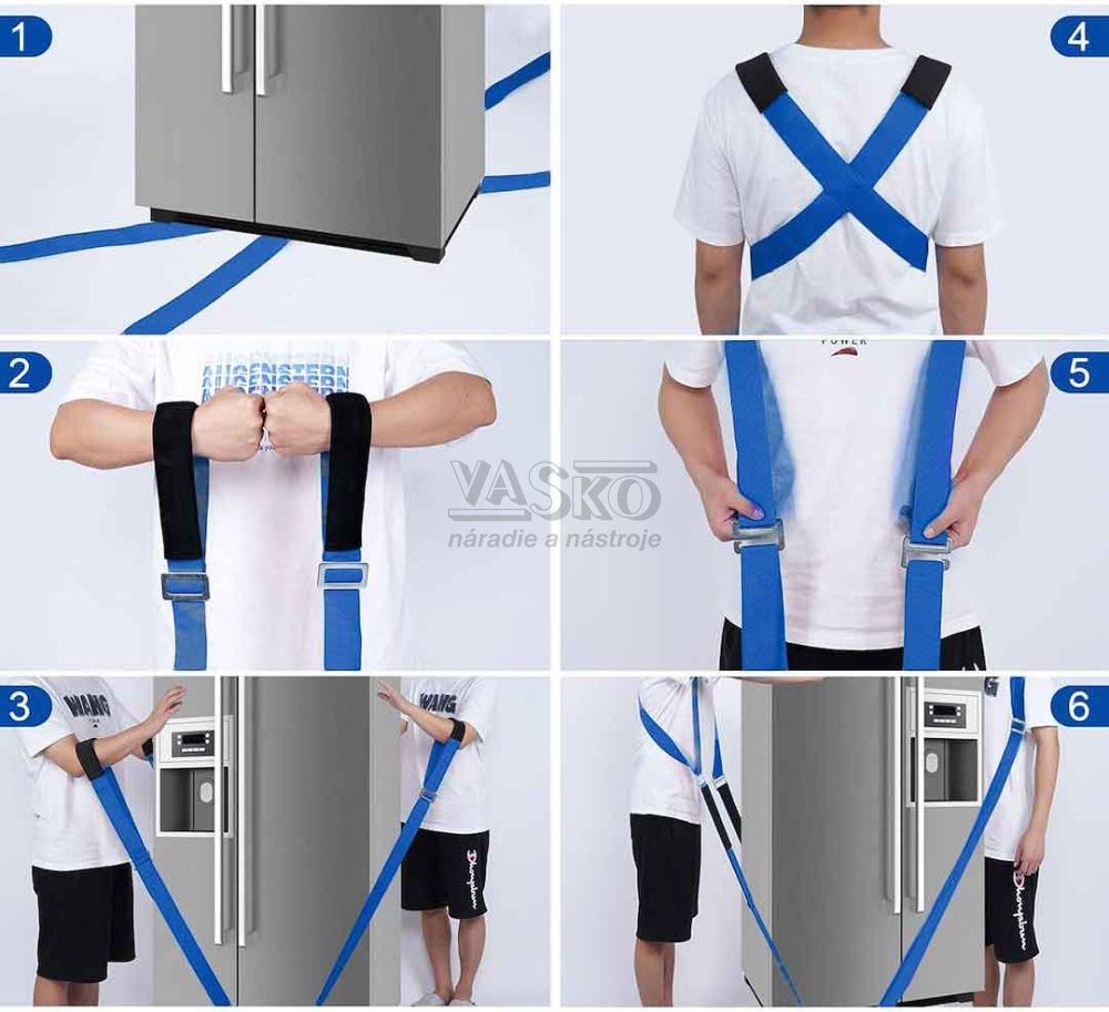 Sada 4 transportných pásov pre pohodlný a stabilný presun ťažkých a objemných predmetov, ako sú skrine, chladničky, práčky a police.Nosnosť až 270 kg a šírka 50 mm zaisťujú rovnomerné rozloženie záťaže, čím sa minimalizuje riziko poškodenia a zranenia.